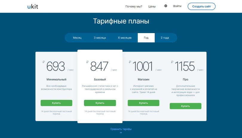 | Минимальный | 495 ₽/мес. | 990 ₽/мес. | Базовые возможности, безлимитный хостинг, SSL, домен, бэкапы, SMS и email-уведомления. Копирайт uKit в подвале. |